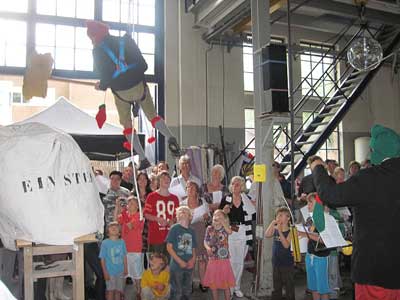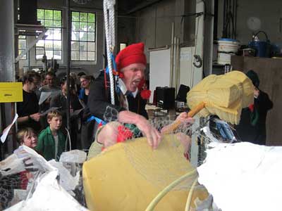 Een korte openingsact met publiekszang en de bedrijfskraan. Ter gelegenheid van de opening van steenhouwerij BamBam
